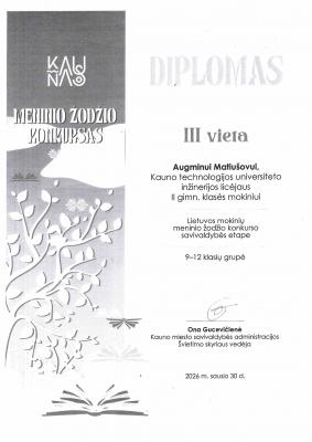 III vieta Lietuvos mokinių meninio žodžio konkurso savivaldybės etape, I-IV gimnazijos klasių grupėje.