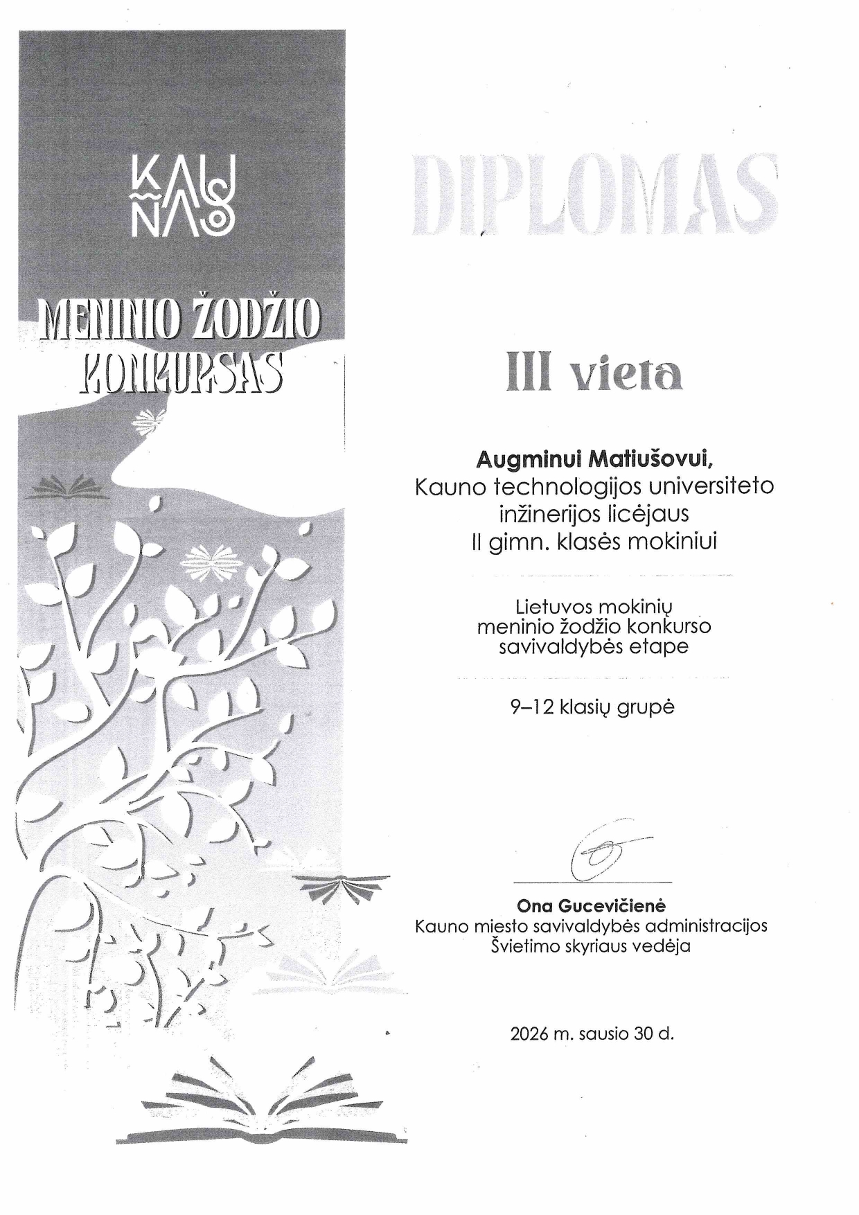 Augminą Matiušovą, IIa gimnazijos klasės mokinį, jo pasiekimas -