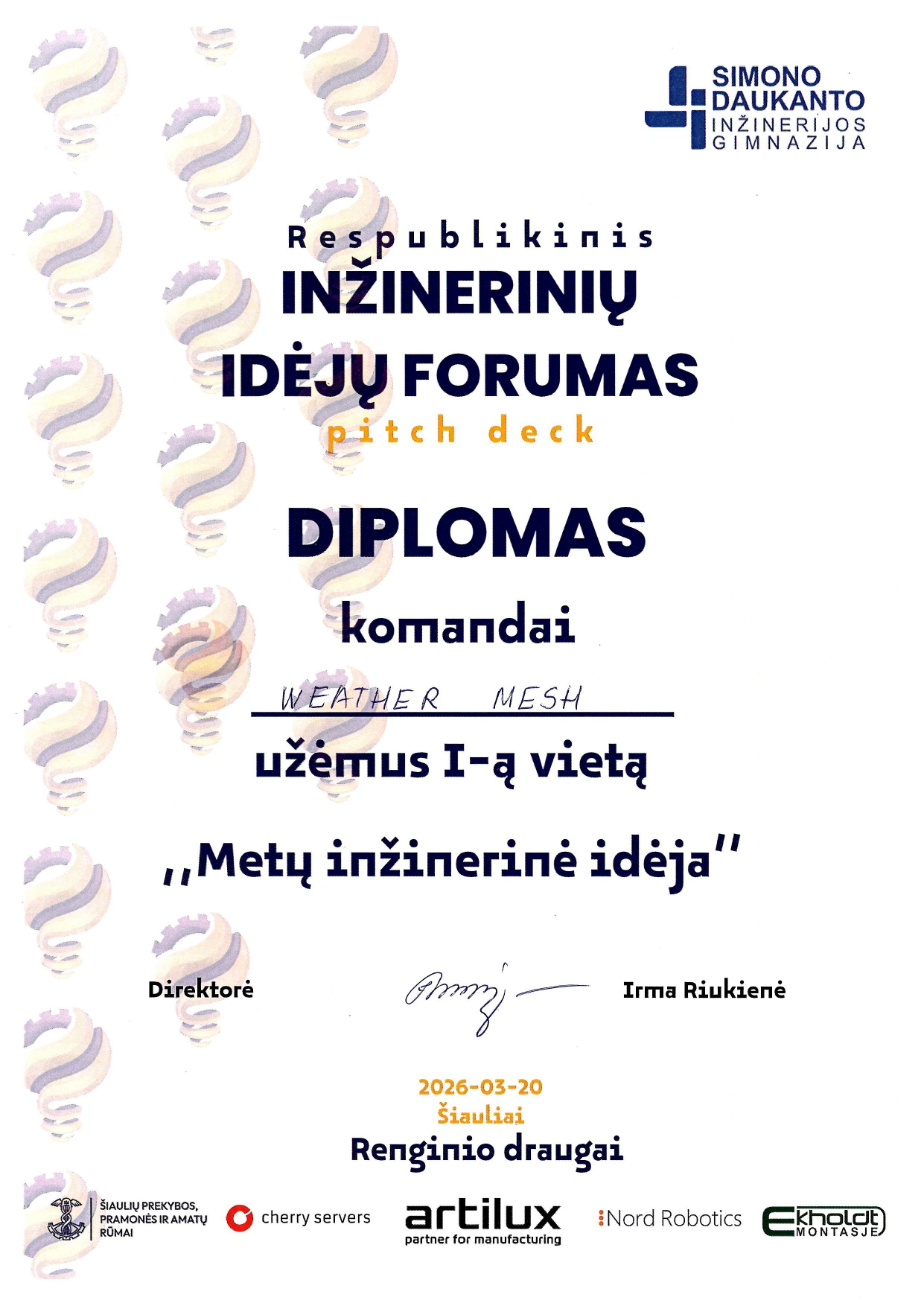 I vieta Lietuvos inžinerijos gimnazijų konkurse ,,INŽINERINIŲ IDĖJŲ FORUMAS: pitch deck'', 9-12 klasių komandų grupėje.