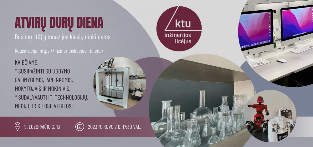 2023 m. kovo 7 dieną, antradienį, 17.30 val., Kauno technologijos universiteto inžinerijos licėjaus administracija kviečia būsimuosius I (9) gimnazijos klasių mokinius ir jų tėvelius susipažinti su mokykla.