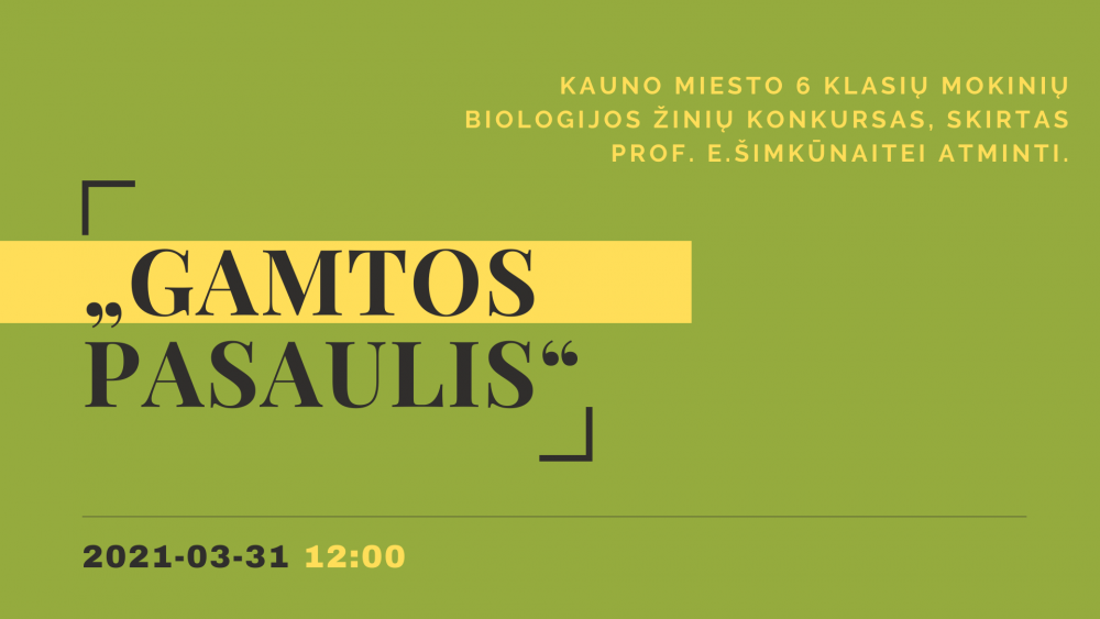 Kovo 31 dieną 12.00 val. nuotoliniu būdu, vyks Kauno miesto 6 klasių mokinių biologijos konkursas „Gamtos pasaulis“, skirtas prof. Eugenijai Šimkūnaitei atminti. Šio konkurso tikslas Skatinti mokinius domėtis Lietuvos gamtos įvairove, jos paplitimu ir ekologine reikšme.