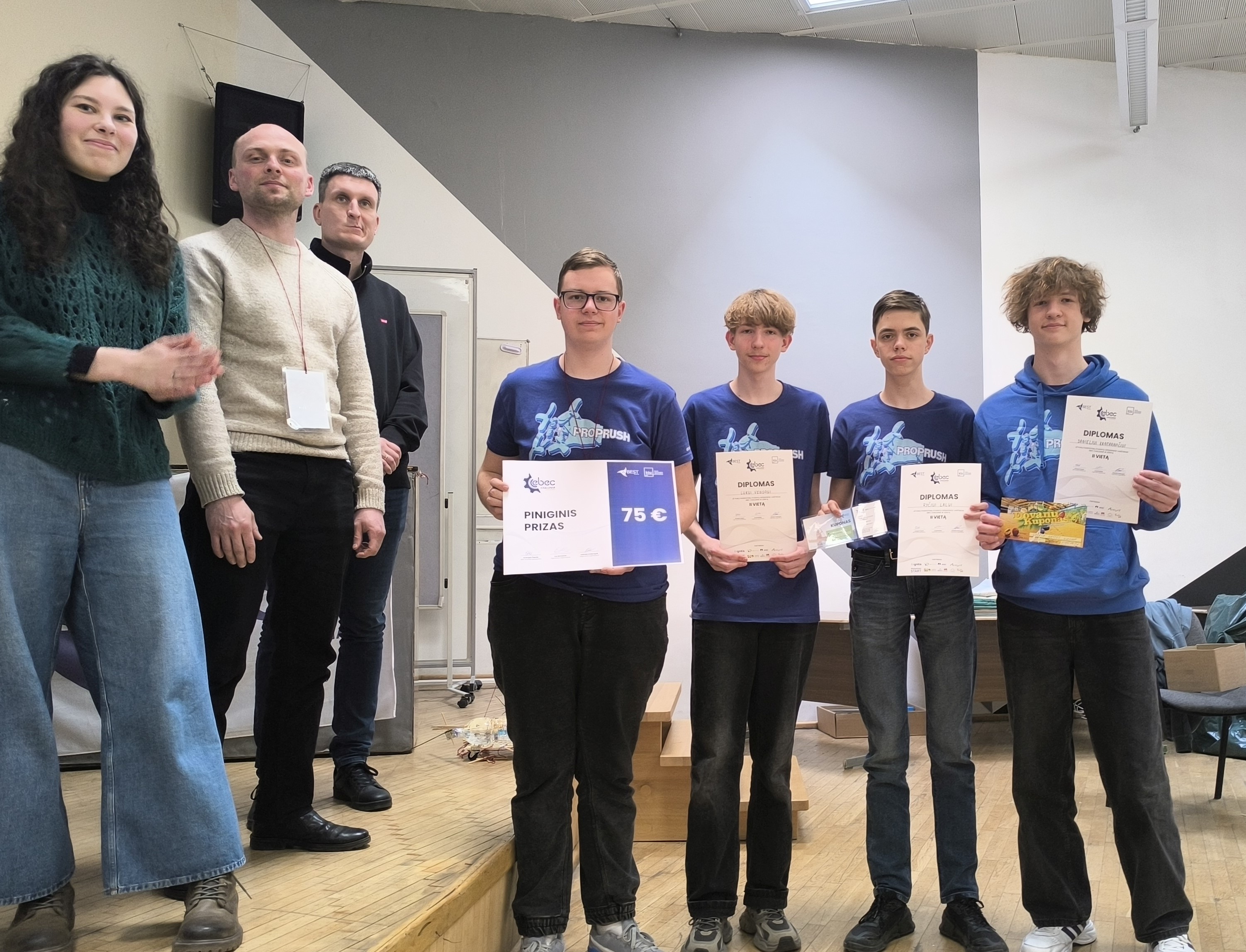 2025 balandžio 4-5 dienomis KTU inžinerijos licėjaus PropRush komanda (Rytis Lalas, Danielius Kantaravičius, Mantas Minkevičius ir Lukas Vengras/Vaidoto g.), vadovaujama mokytojo Žilvino Tarvydo, buvo pakviesta dalyvauti BEST Kaunas (https://bestkaunas.org/) inžineriniame konkurse EBEC, kur susirungė jau ne mokykliniame lygmenyje, o konkuravo su inžineriją studijuojančiais studentais. Komanda, naudodama pateiktas medžiagas ir įrankius, sukonstravo geriausiai veikiantį kraną/ekskavatorių. Visų nuostabai – komanda aplenkė ne vieną studentų komandą ir laimėjo II vietą!!! Sveikiname ir didžiuojamės jaunaisiais KTU inžinerijos licėjaus talentais ir mokytojais!