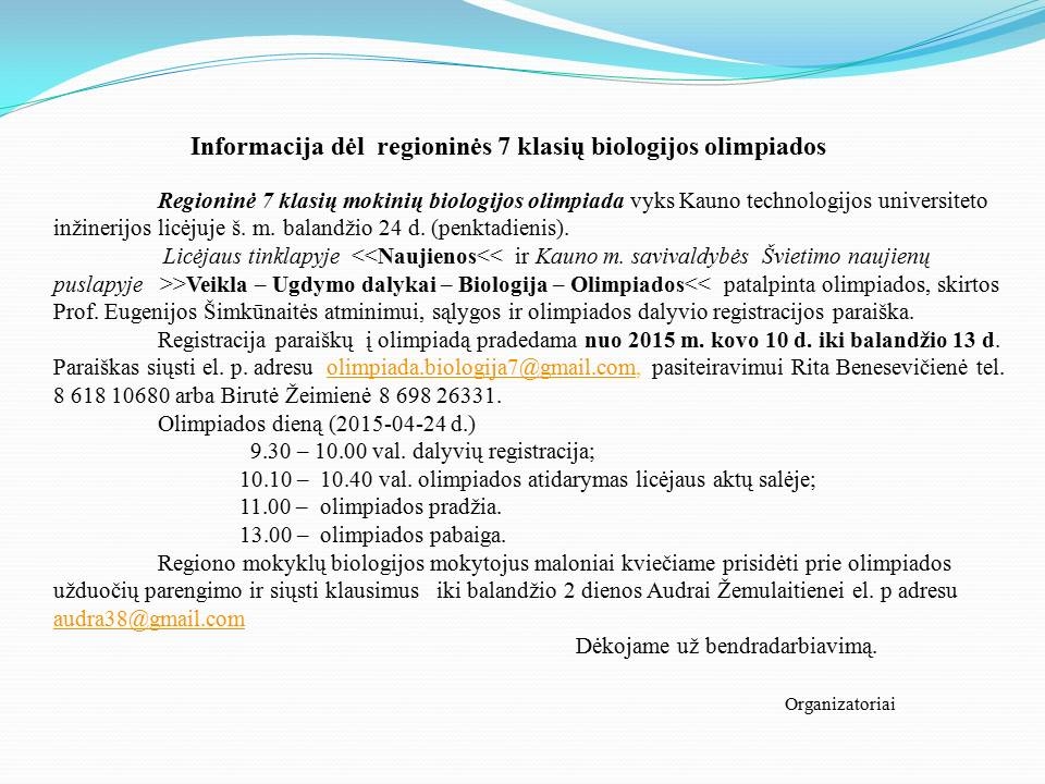 Regionų mokyklos biologijos mokytojus maloniai kviečiame prisidėti prie olimpiados užduočių parengimo ir siųsti klausimu iki balandžio 2 dienos Audrai Žemulaitienei el. p. adresu audra38@gmail.com