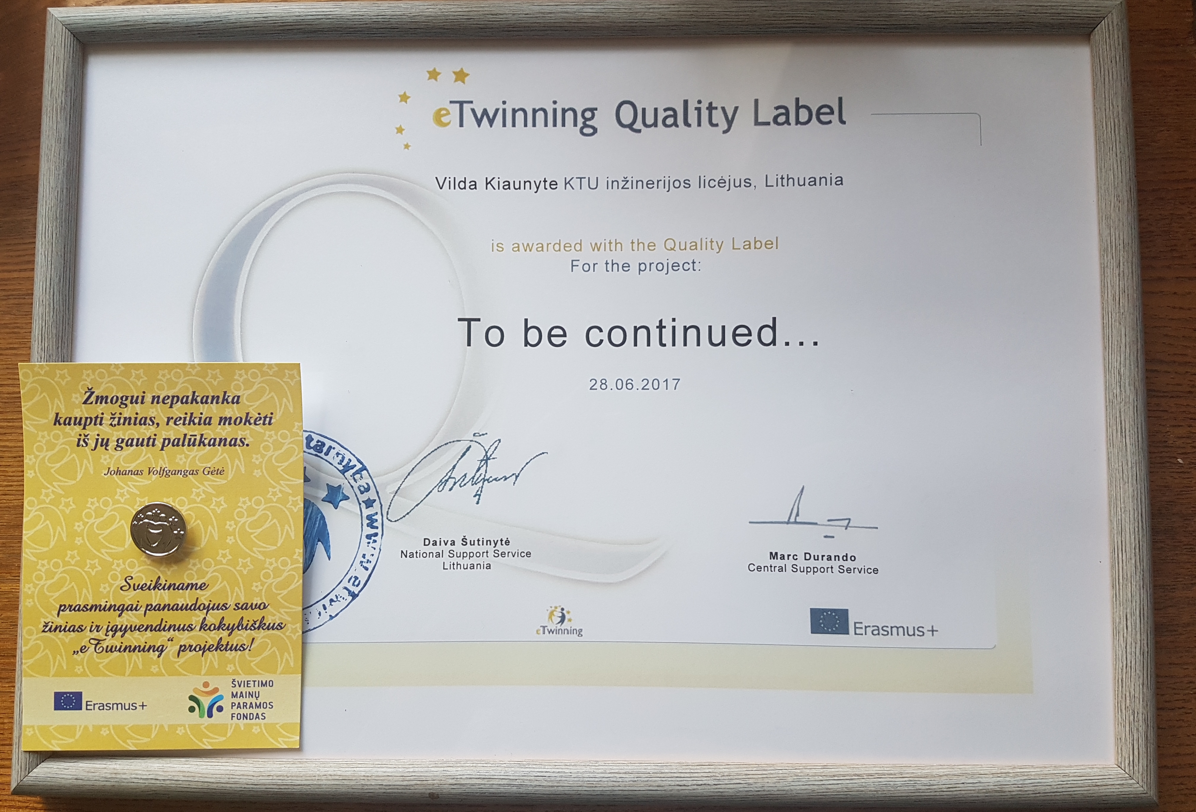 Š.m. rugpjūčio 23-25 dienomis Vilniuje, Crowne Plaza viešbutyje įvyko kasmetiniai tarpmokyklinių projektų programos eTwinning nacionaliniai apdovanojimai. Mūsų mokyklos mokytoja Vilda Kiaunytė taip pat atsiėmė nacionalinį eTwinning ženklelio apdovanojimą už 2016-2017 m. m. vykdytą tarptautinį projektą “To be continued…”. Projekto metu 7d ir 8c klasių mokiniai kūrė istoriją anglų kalba kartu su mokiniais iš Kauno “Aušros” gimnazijos, Kroatijos, Latvijos, Slovakijos ir Čekijos. Į projektą įsitraukė ir daugiau šalių grupių, todėl rezultatas – net trys skirtingos istorijos. Mokiniai iliustravo savo sukurtą istoriją „Corrupting Light“, vėliau pagal ją sukūrėir filmuką. Projektas buvo puikiai įvertintas tiek Lietuvos, tiek tarptautiniu lygiu – jam suteikta ne tik Lietuvos, bet ir Kroatijos bei Portugalijos nacionaliniai ženkleliai.