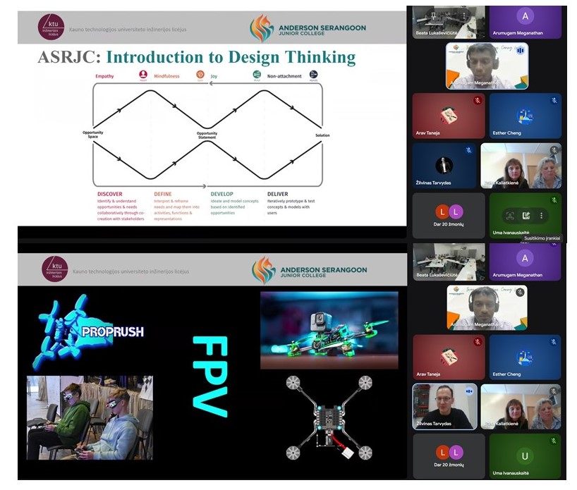 ASRJC atstovas Arumugam Meganathan kartu su kolegomis aptarė būsimų pamokų struktūrą bei dizaino mąstymo (Design Thinking) metodą, kuris padeda mokiniams kūrybiškai spręsti realias problemas. Inžinerijos mokytojai: Edita Kaliatkienė, Laura Aitmanė, Žilvinas Tarvydas ir Ramūnas Ramanauskas supažindino projekto dalyvius su būsimų pamokų veiklomis, jų įgyvendinimo būdus ir formomis.