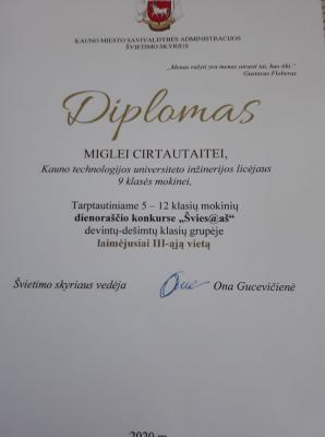 Sveikiname MIGLĘ CIRTAUTAITĘ, licėjaus (S. Lozoraičio g.), Ia gimnaz. kl. mokinę tarptautiniame 5-12 klasių mokinių dienoraščio konkurse "Švies@aš", devintų-dešimtų klasių grupėje, laimėjusią III-ąją vietą.