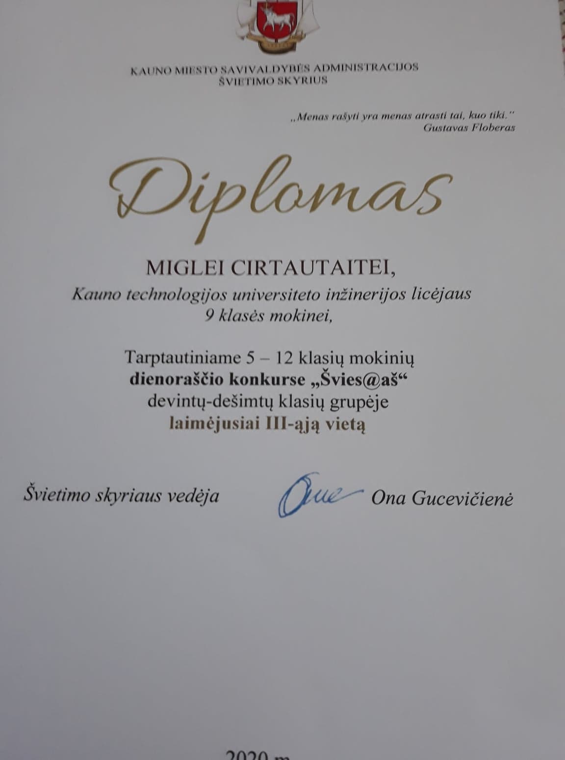 III-oji vieta tarptautiniame 5-12 klasių mokinių dienoraščio konkurse "Švies@aš", devintų-dešimtų klasių grupėje.