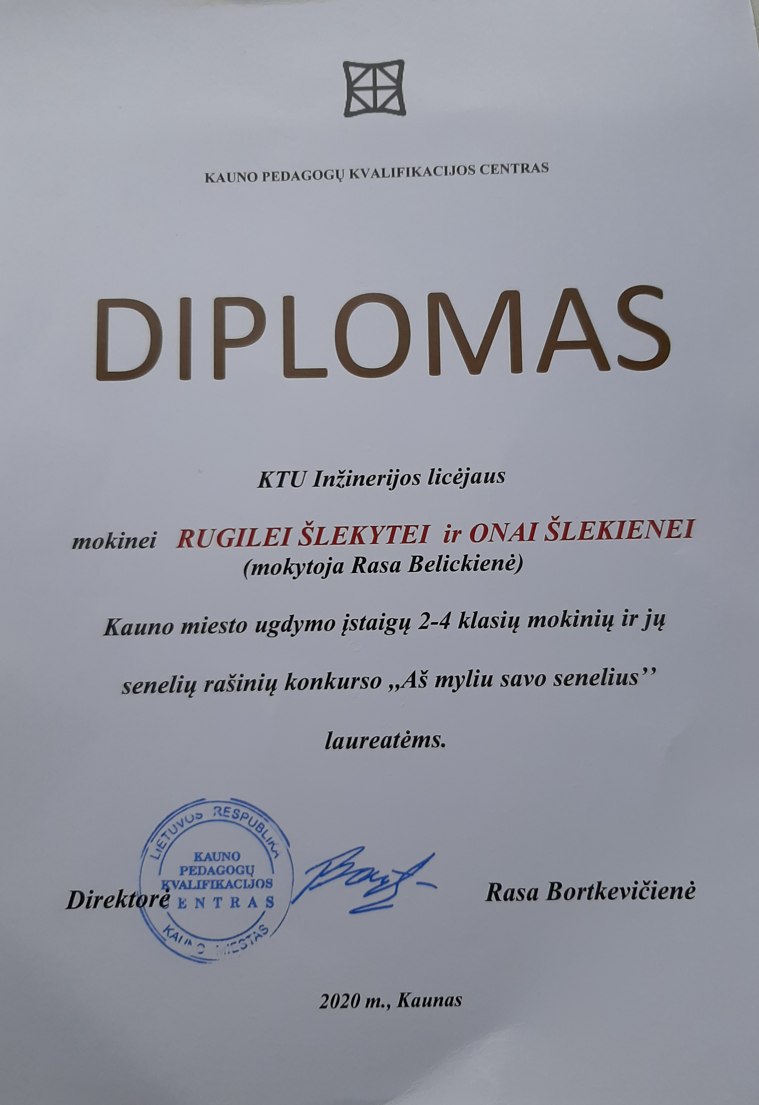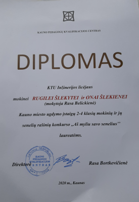 Sveikiname Rugilę Šlekytę, licėjaus (Žeimenos g.), 2b klasės mokinę, Kauno miesto ugdymo įstaigų 2-4 klasių mokinių ir jų senelių rašinių konkurso "Aš myliu savo senelius" laureatę.