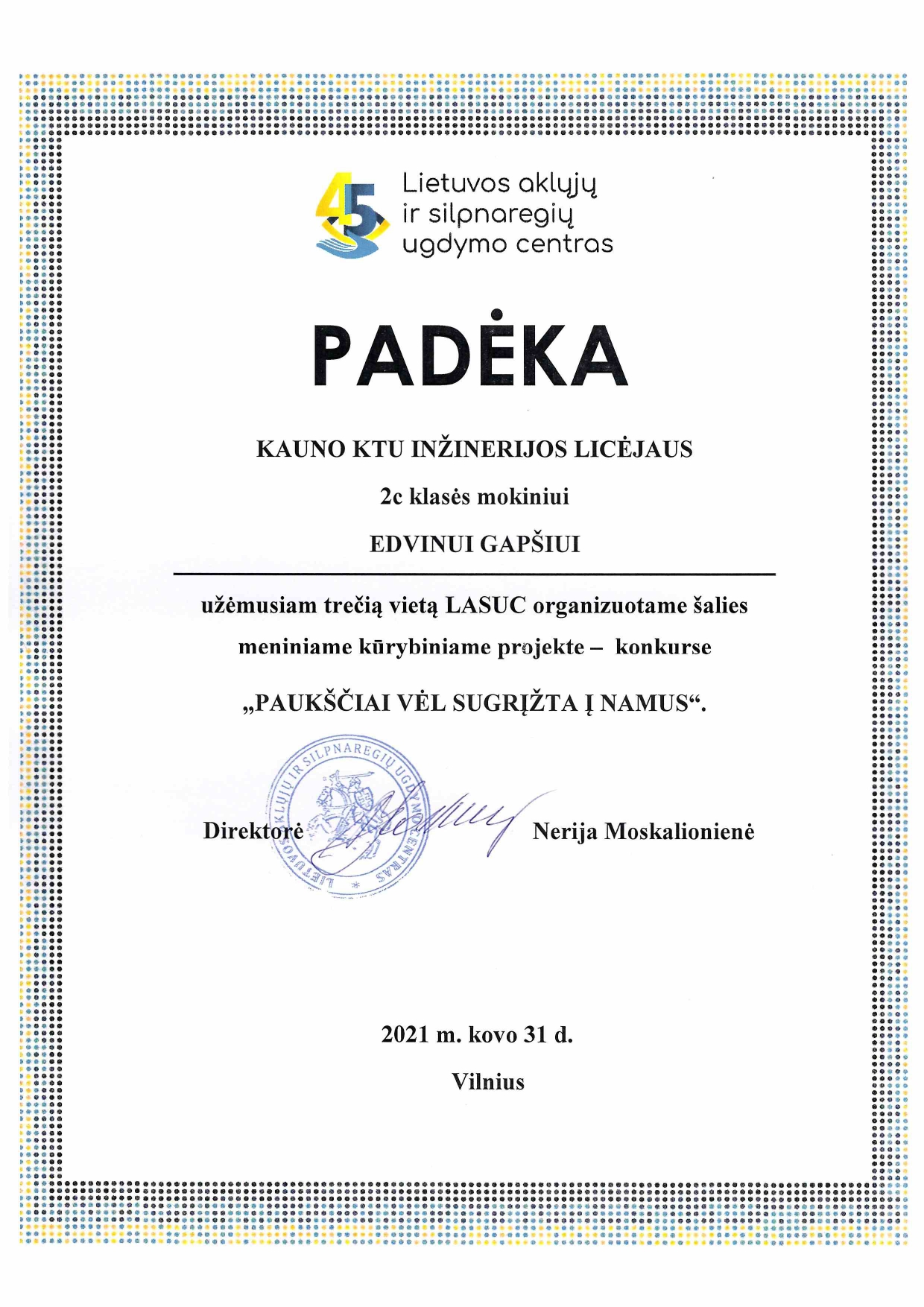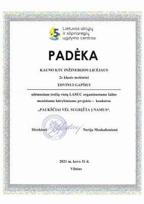 Sveikiname Lietuvos aklųjų ir silpnaregių centro organizuoto šalies mokinių meninio kūrybinio projekto-parodos "Paukščiai vėl sugrįžta į namus" 1-4 klasių mokinių grupės 3 vietos laimėtoją Edviną Gapšį, 2c klasės mokinį (Žeimenos g.).