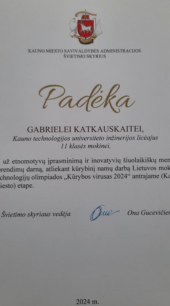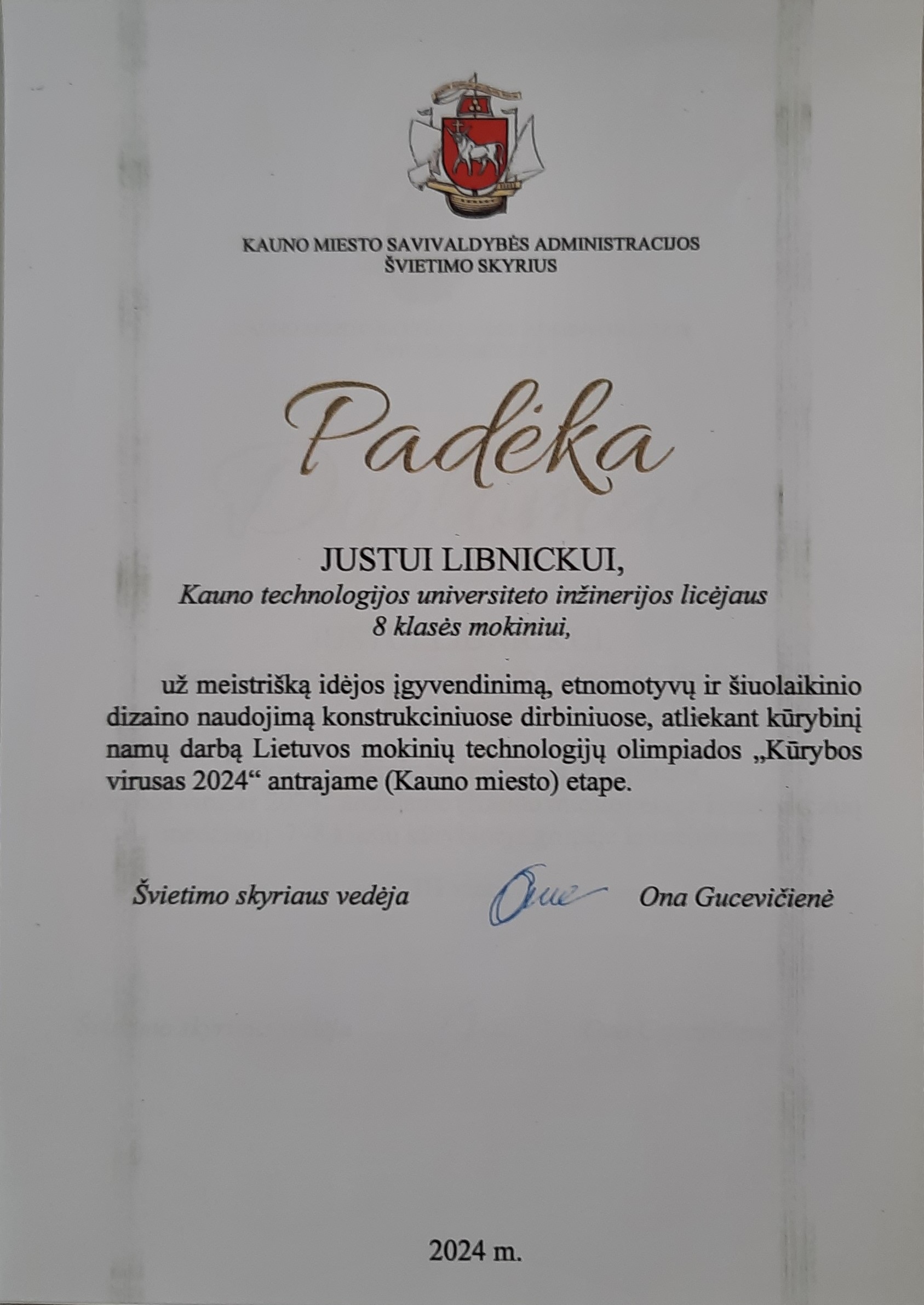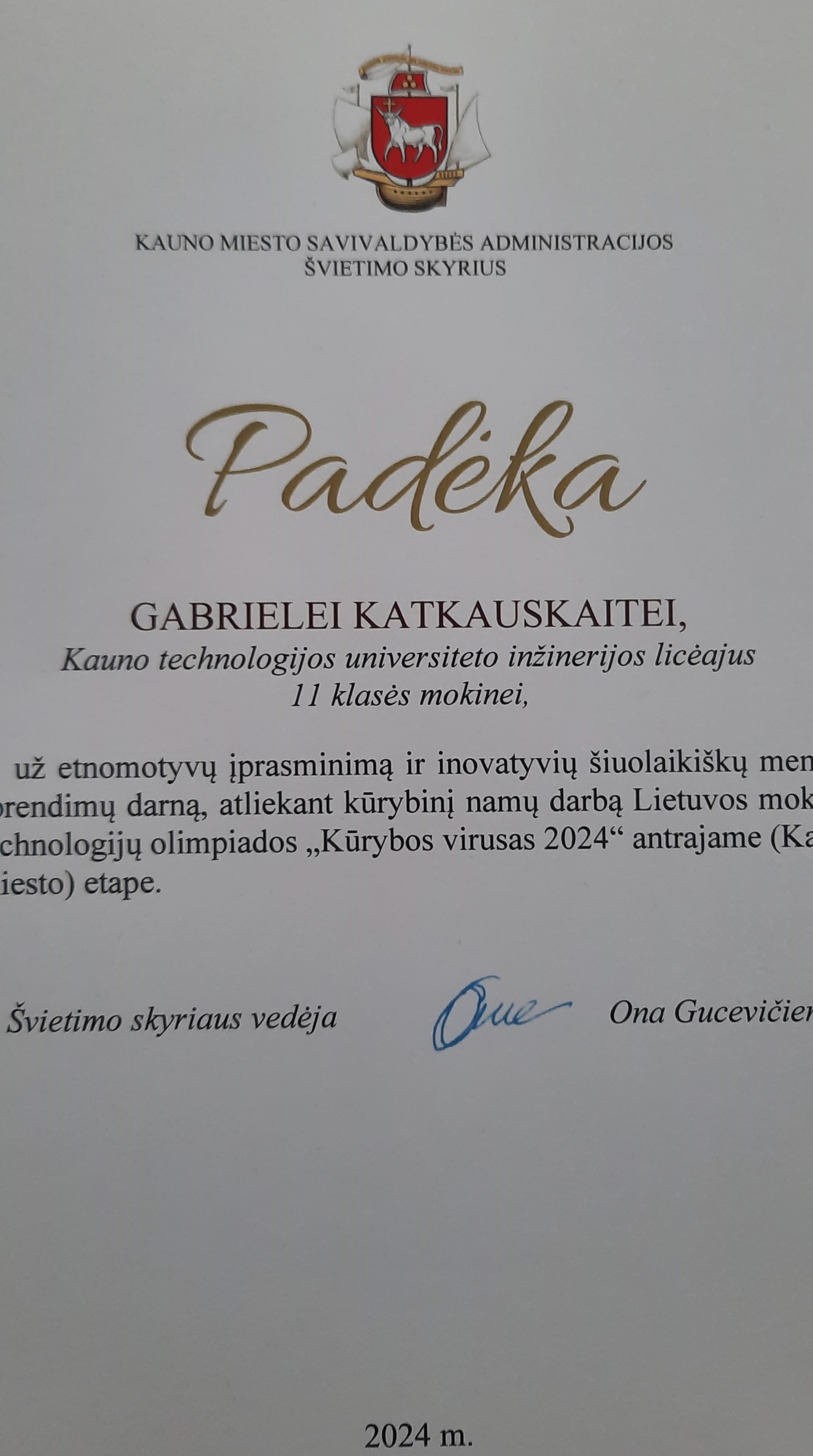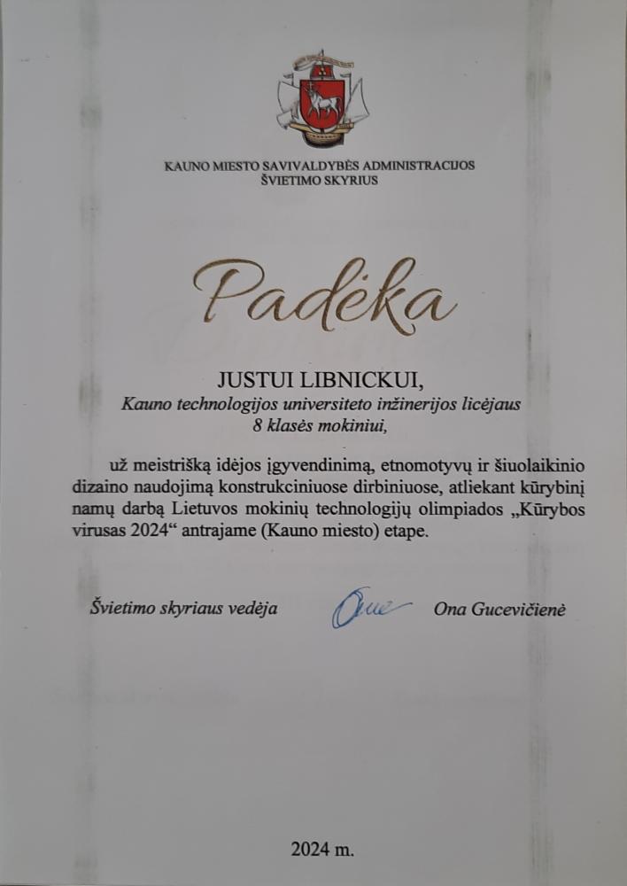 Sveikiname Lietuvos moksleivių technologijų olimpiadoje „Kūrybos virusas 2024“ Kauno mieste (II turas) 7- 8 kl. konstrukcinių medžiagų grupėje Justą Libnicką (8c kl., mokyt. R. Andriuška) užėmus III vietą ir pelniusį „Už meistrišką idėjos įgyvendinimą, etnomotyvų ir šiuolaikinio dizaino naudojimą konstrukciniuose dirbiniuose“ nominaciją už namų darbą ir Gabrielę Katkauskaitę gimnazinių klasių tekstilės grupėje (III a gimn. kl., mokyt. V.Valatkienė) pelniusią nominaciją ,,Už etnomotyvų įprasminimą ir inovatyvių šiuolaikiškų meninių sprendimų darną".