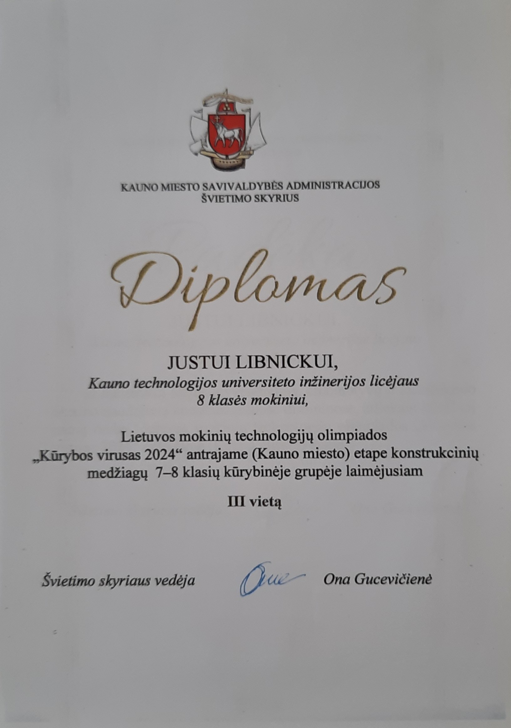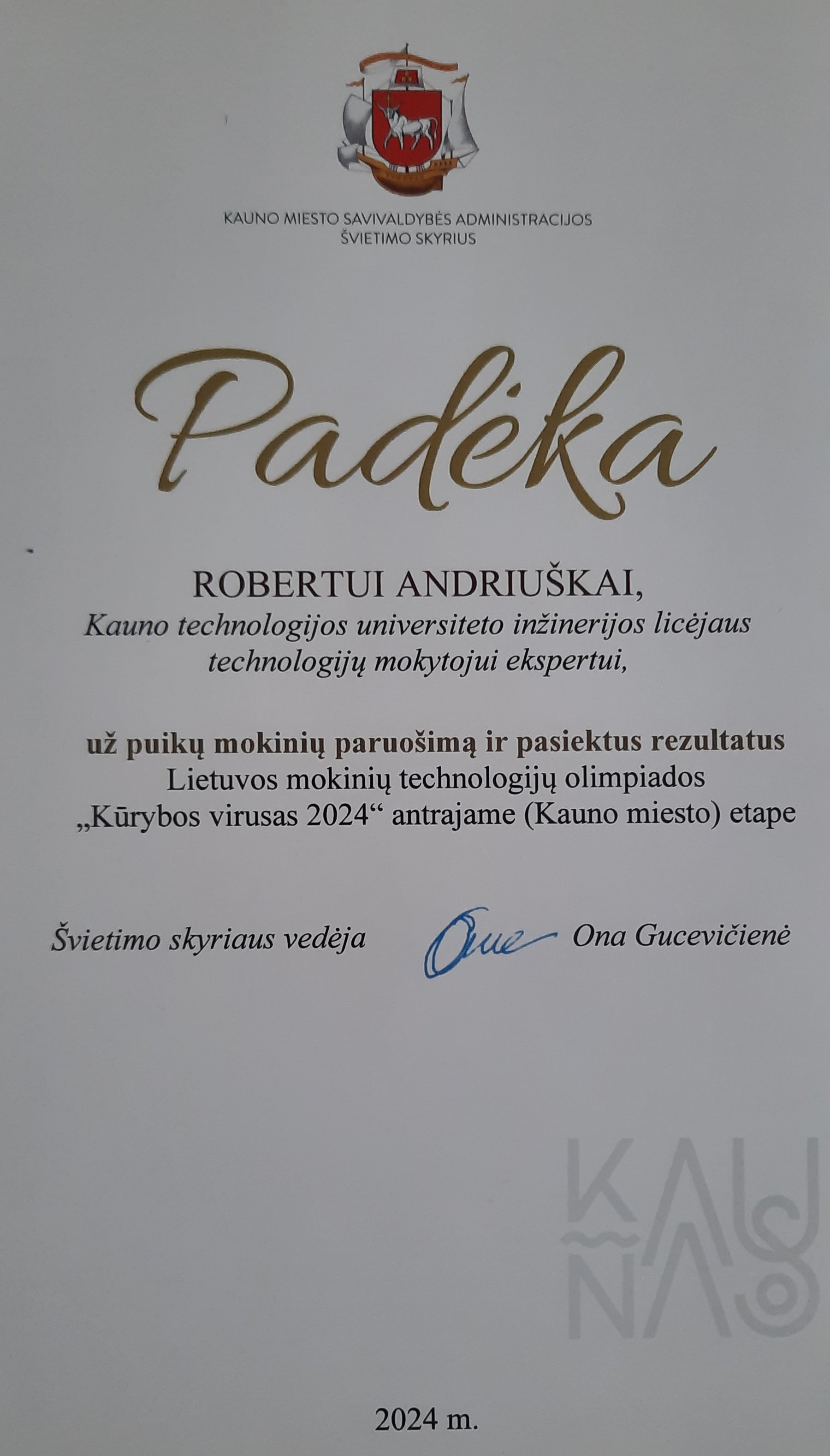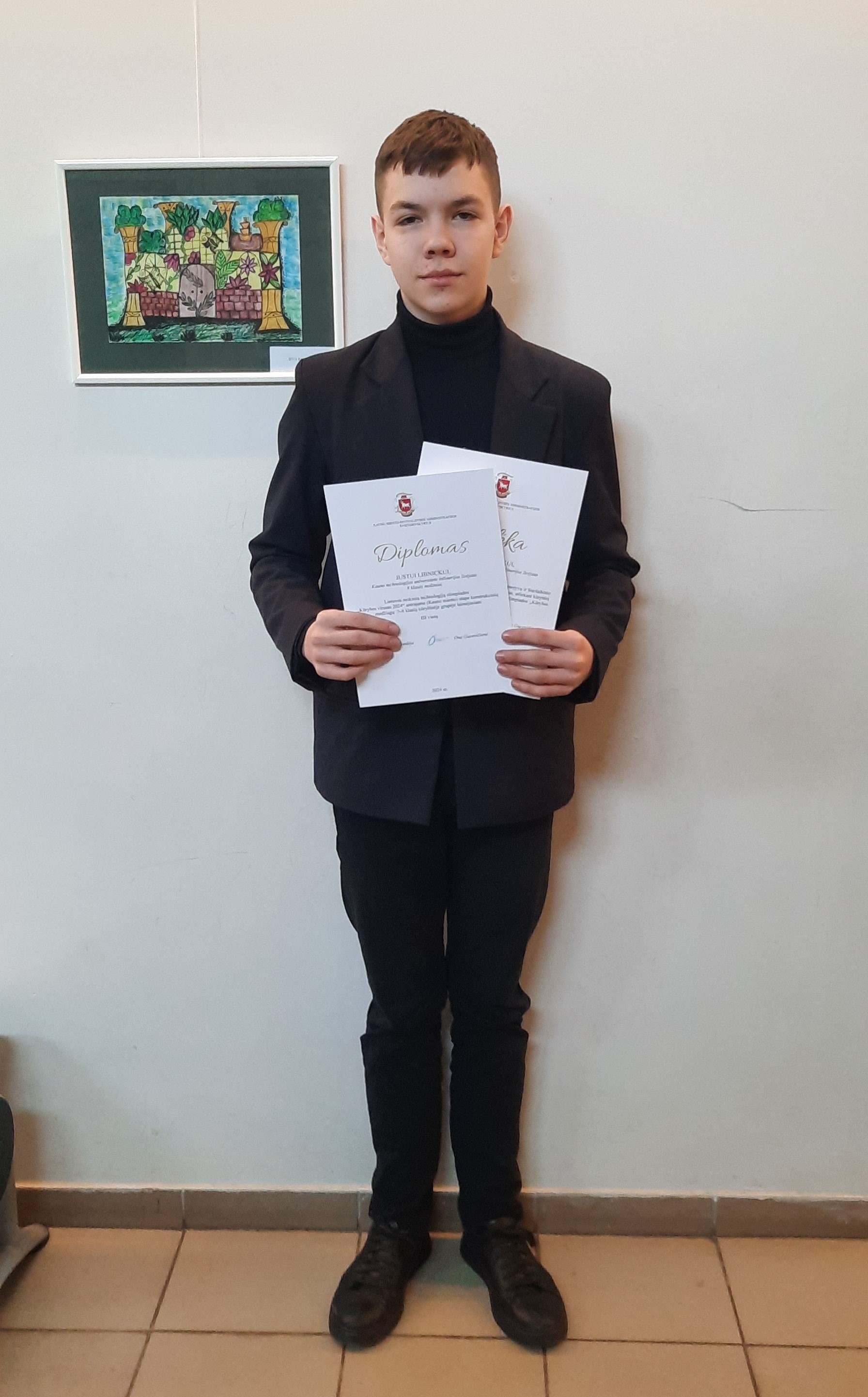 Sveikiname Lietuvos moksleivių technologijų olimpiadoje „Kūrybos virusas 2024“ Kauno mieste (II turas) 7- 8 kl. konstrukcinių medžiagų grupėje Justą Libnicką (8c kl., mokyt. R. Andriuška) užėmus III vietą ir pelniusį „Už meistrišką idėjos įgyvendinimą, etnomotyvų ir šiuolaikinio dizaino naudojimą konstrukciniuose dirbiniuose“ nominaciją už namų darbą ir Gabrielę Katkauskaitę gimnazinių klasių tekstilės grupėje (III a gimn. kl., mokyt. V.Valatkienė) pelniusią nominaciją ,,Už etnomotyvų įprasminimą ir inovatyvių šiuolaikiškų meninių sprendimų darną".
