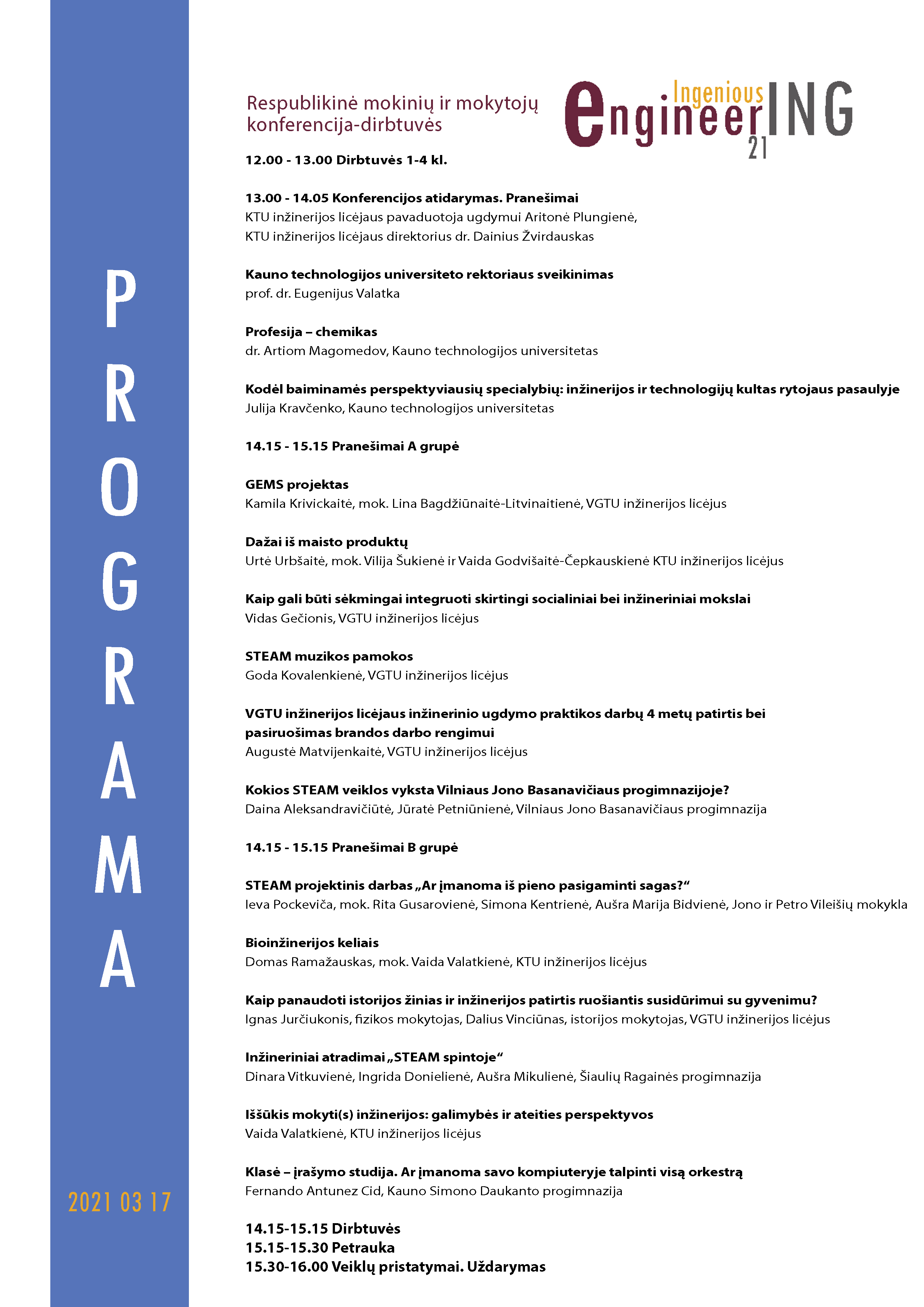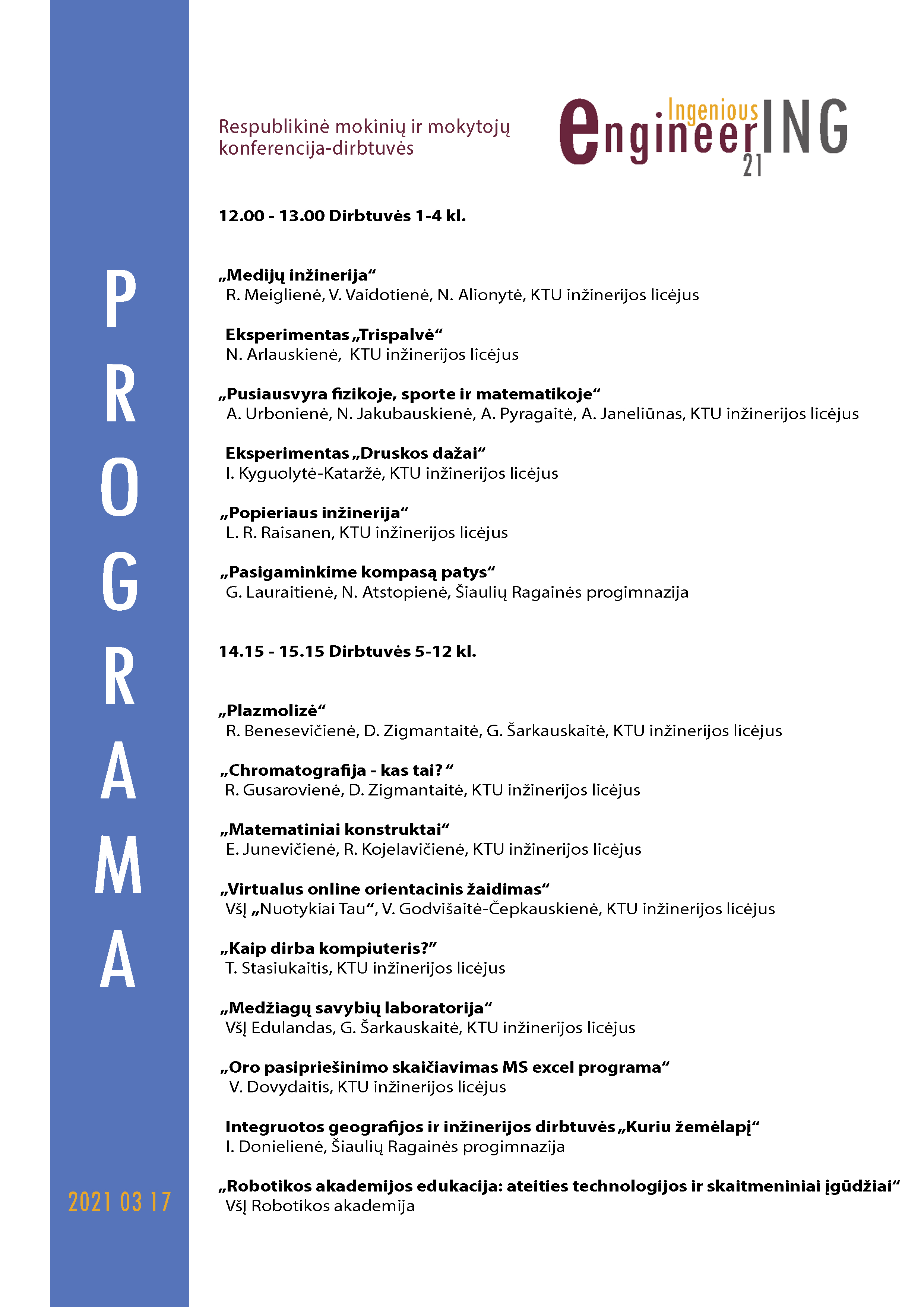 Kviečiame visus užsiregistravusius mokytojus ir mokinius į mokslinę – praktinę konferenciją – dirbtuves „Ingenious Engineering‘21”, kuri vyks nuotoliniu būdu.