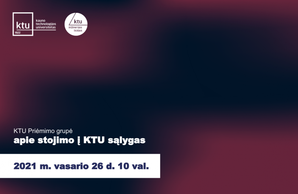 02-26 d. 10 val. kviečiame į KTU Priėmimo grupės pristatymą apie bendruosius reikalavimus ir kitą aktualią stojimui į Kauno technologijos universitetą informaciją 2021 metais. Aktualia informacija dalinsis KTU Priėmimo grupės vyresnioji koordinatorė Vaiva Šlėderienė. Taip pat renginyje dalyvaus Studijų procesų skyriaus vadovė Sandra Kavalevskytė ir priėmimo organizavimo specialistė Edita Benesevičienė.